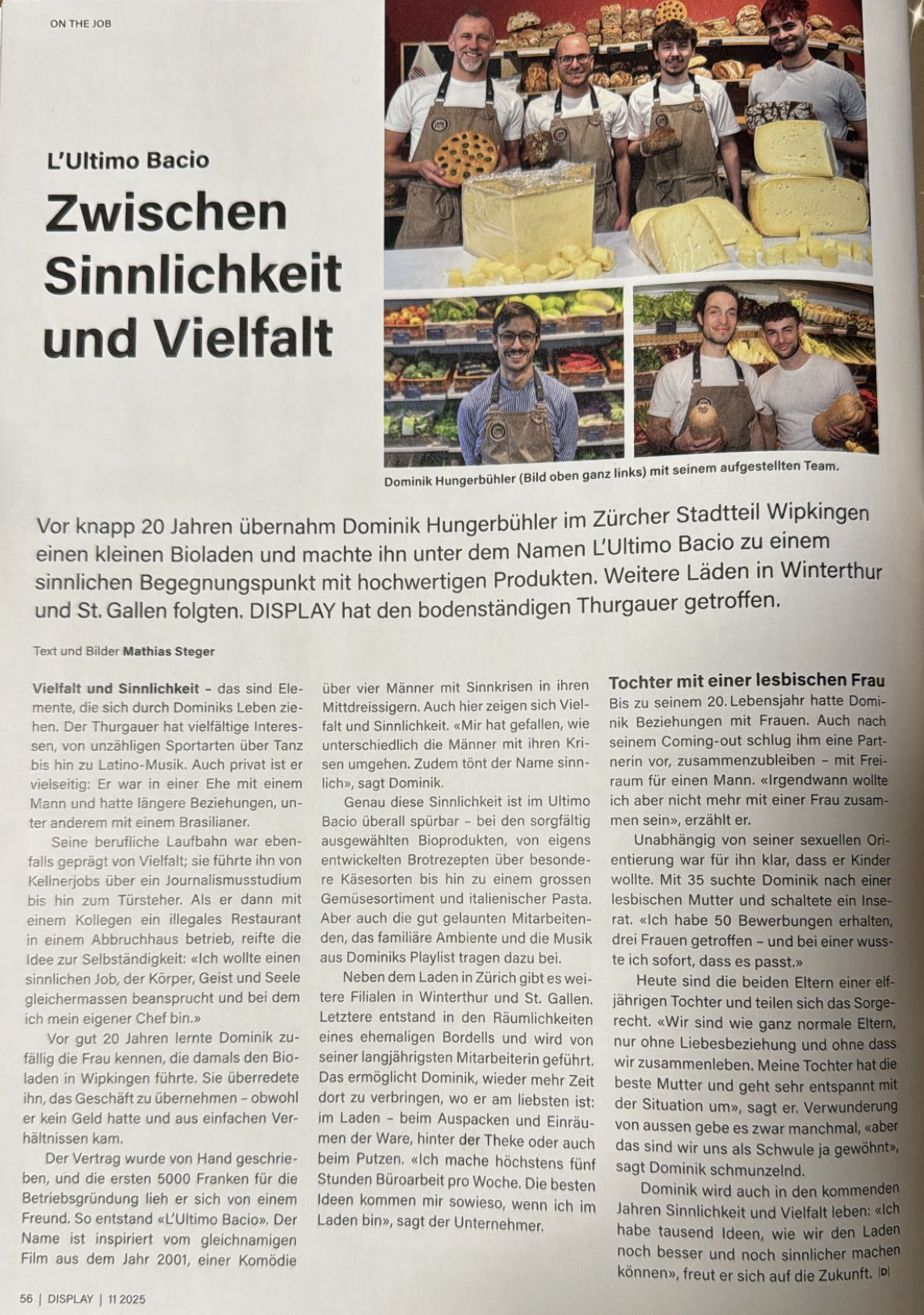 «Vor knapp 20 Jahren übernahm Dominik Hunger-bühler im Zürcher Stadtteil Wipkingen einen kleinen Bioladen und machte ihn unter dem Namen L'Ultimo Bacio zu einem sinnlichen Begegnungs-punkt mit hochwertigen Produkten. Weitere Läden in Winterthur und St. Gallen folgten. DISPLAY hat den bodenständigen Thurgauer getroffen.»