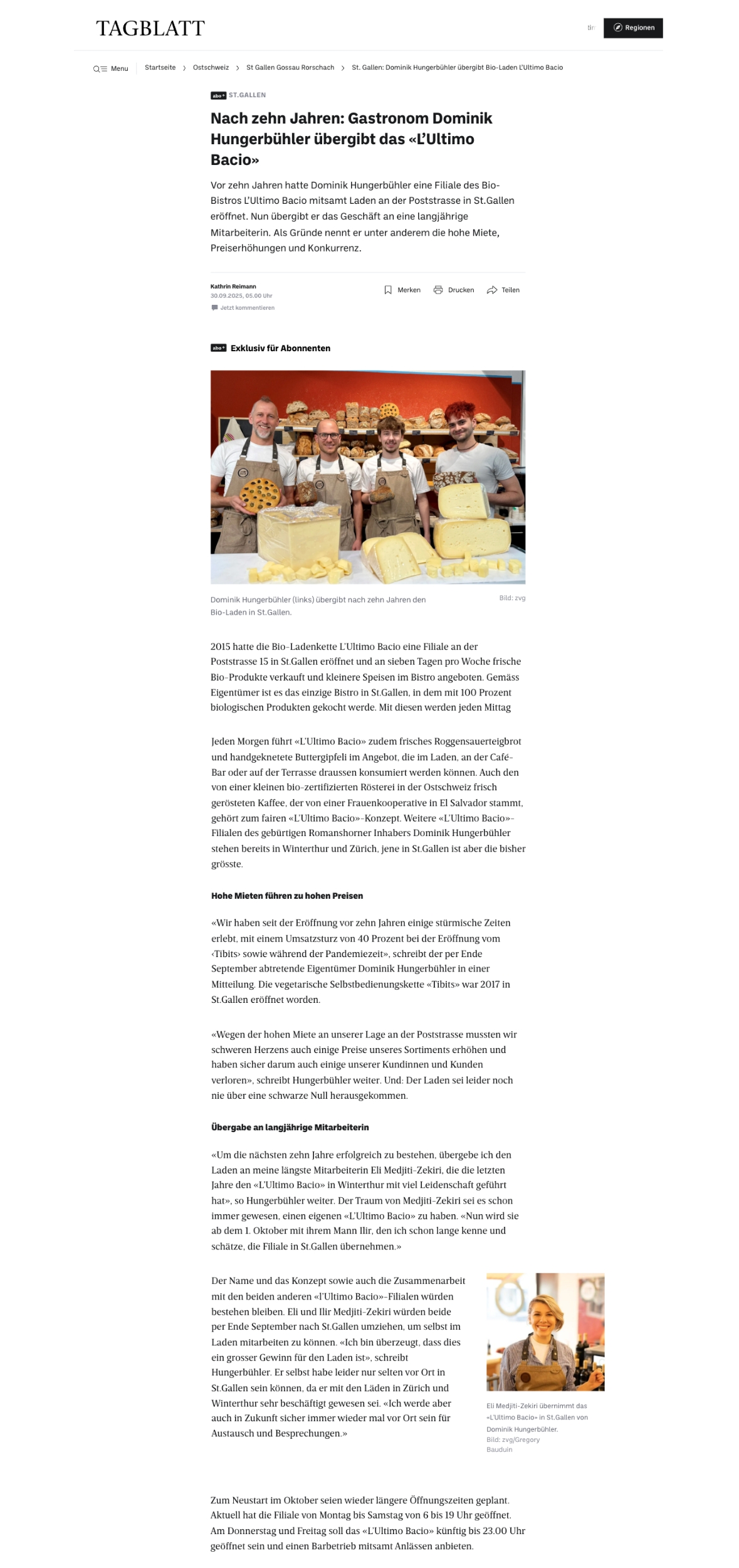 «Vor zehn Jahren hatte Dominik Hungerbühler eine Filiale des Bio-Bistros L’Ultimo Bacio mitsamt Laden an der Poststrasse in St.Gallen eröffnet. Nun übergibt er das Geschäft an eine langjährige Mitarbeiterin. Als Gründe nennt er unter anderem die hohe Miete, Preiserhöhungen und Konkurrenz.»